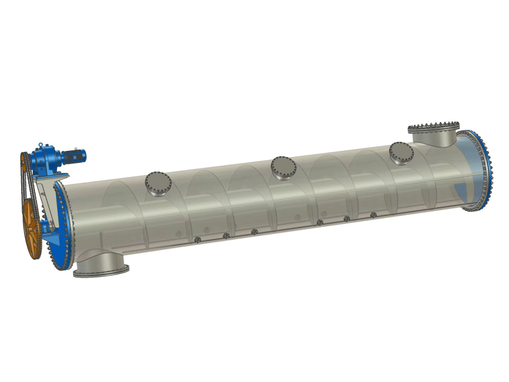 螺旋式蒸煮管內(nèi)設(shè)有螺旋軸,當(dāng)螺旋軸旋轉(zhuǎn)時(shí),螺旋葉片推動(dòng)物料沿著管體軸向移動(dòng)。由于螺旋結(jié)構(gòu)的特性,物料在移動(dòng)過程中同時(shí)還會(huì)產(chǎn)生一定的翻轉(zhuǎn)和攪拌效果,使物料在輸送過程中能夠和內(nèi)部的蒸汽以及化工藥液均勻混合,保證了物料在蒸煮管內(nèi)均勻快速的加熱與反應(yīng)。